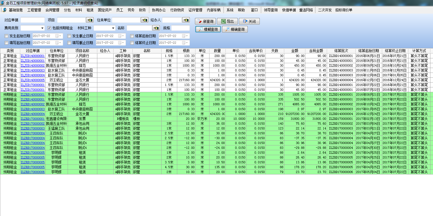 在租賃管理方便,經(jīng)常租一些周轉(zhuǎn)材料,跟租賃公司都是長期合作,結(jié)算方式都是采用季度結(jié)算或者年度結(jié)算,之前采用紙質(zhì)或者excel統(tǒng)計(jì),統(tǒng)計(jì)并不準(zhǔn)確,到季度或者年度結(jié)算時往往統(tǒng)計(jì)不準(zhǔn)確,都是按照供應(yīng)商提供數(shù)據(jù)進(jìn)行結(jié)算,具體租賃費(fèi)并沒有參考依據(jù)。采用金石項(xiàng)目管理軟件后,可以實(shí)時查看租賃情況,統(tǒng)計(jì)租賃庫存,并且最后結(jié)算時選好結(jié)算批次可以自動計(jì)算結(jié)算租金。在租賃過程中并可以實(shí)時查看預(yù)期租金,評估預(yù)期成本。采用采用金石項(xiàng)目管理軟件后租金統(tǒng)計(jì)準(zhǔn)確,對后期結(jié)算產(chǎn)生了很大的幫助。