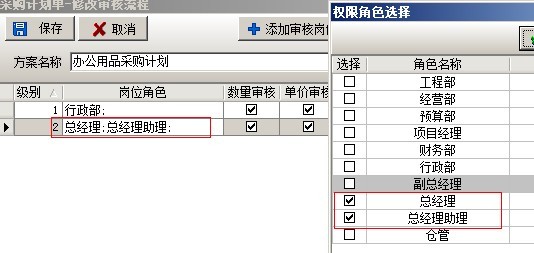 在多級審核中,可以設置多套審核方案,每套方案可設置多個崗位,可設置方案的授權發起用戶(在業務單據中選擇該審核方案的用戶)。在添加方案時,有三種方式逐級審核、平級審核、跨級審核。逐級審核是指各個崗位按先后順序依次審核該業務單據,例如審核順序為,工程部、預算部、經營部、總經理如下圖: