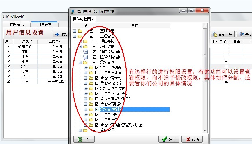 點擊【用戶管理權限設置】在彈出的窗口中來設置用戶操作權限。