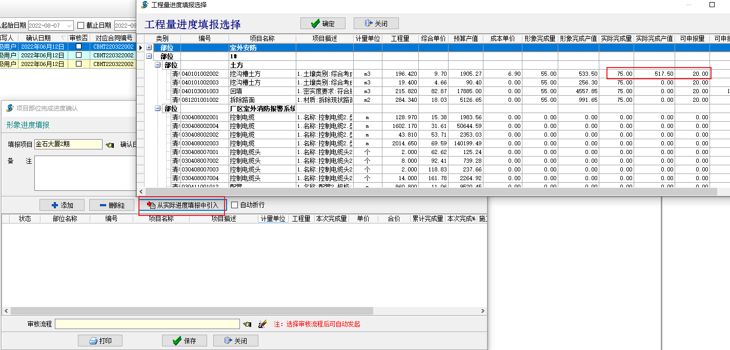 若選擇形象進度時,可以選擇從實際進度填報中引入,選擇已經發生實際填報的清單,雙擊調入過來,然后依次對本次完成量或完成百分比進行輸入,此時的單價為【部分分解及工程量清單】中的綜合單價,本步驟完成后,可以看到當前進度填報的產值,接下來可以打印或者導出,為甲方申報進度款使用。