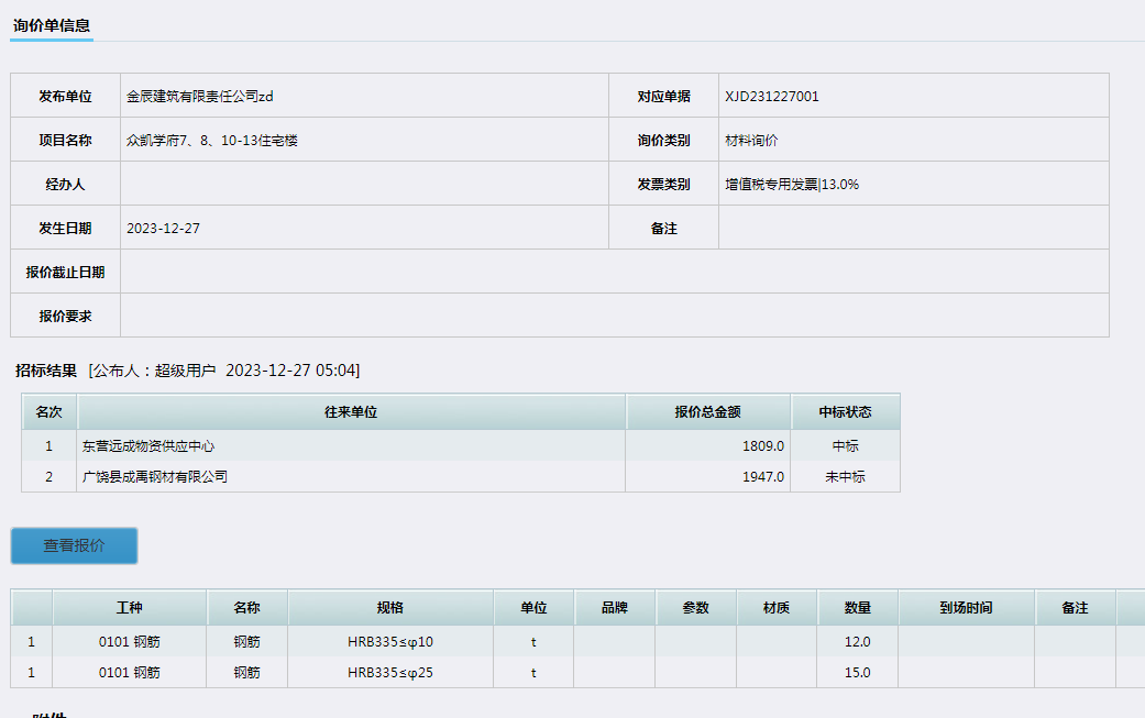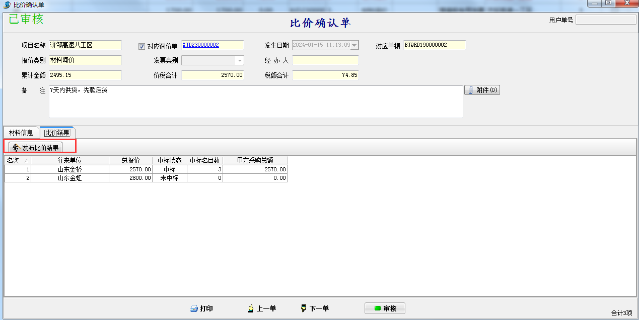 在比價確認單確定好供應商后可以直接發布比價結果