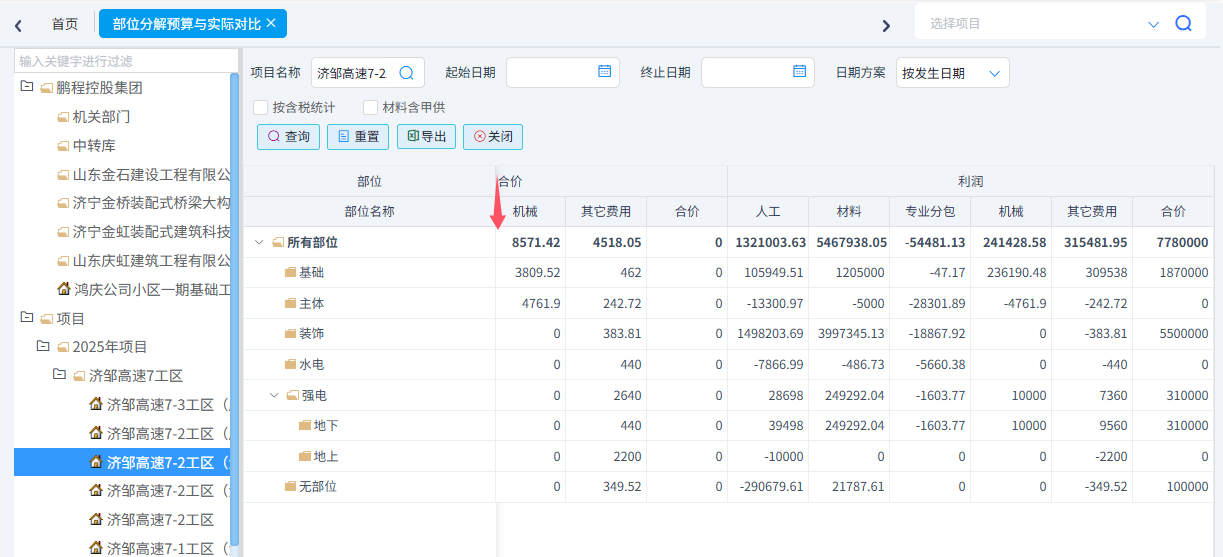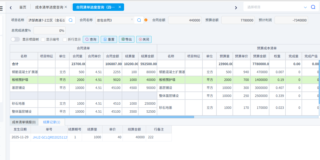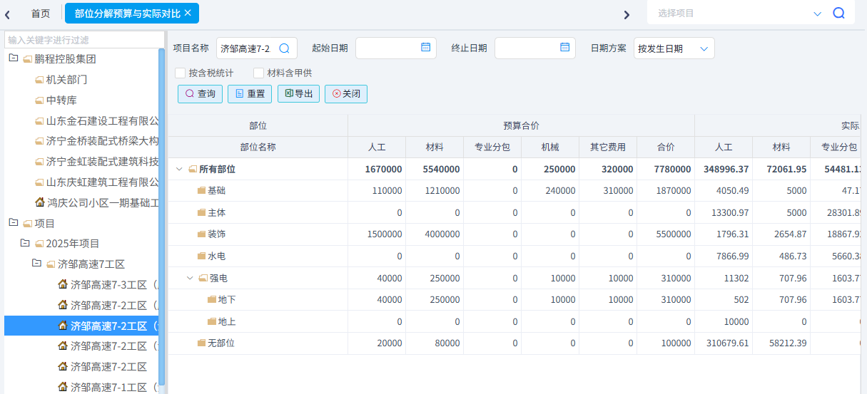 可以統(tǒng)計工料機預算與實際對比、合同清單與實際發(fā)生對比、分部分項四算對比