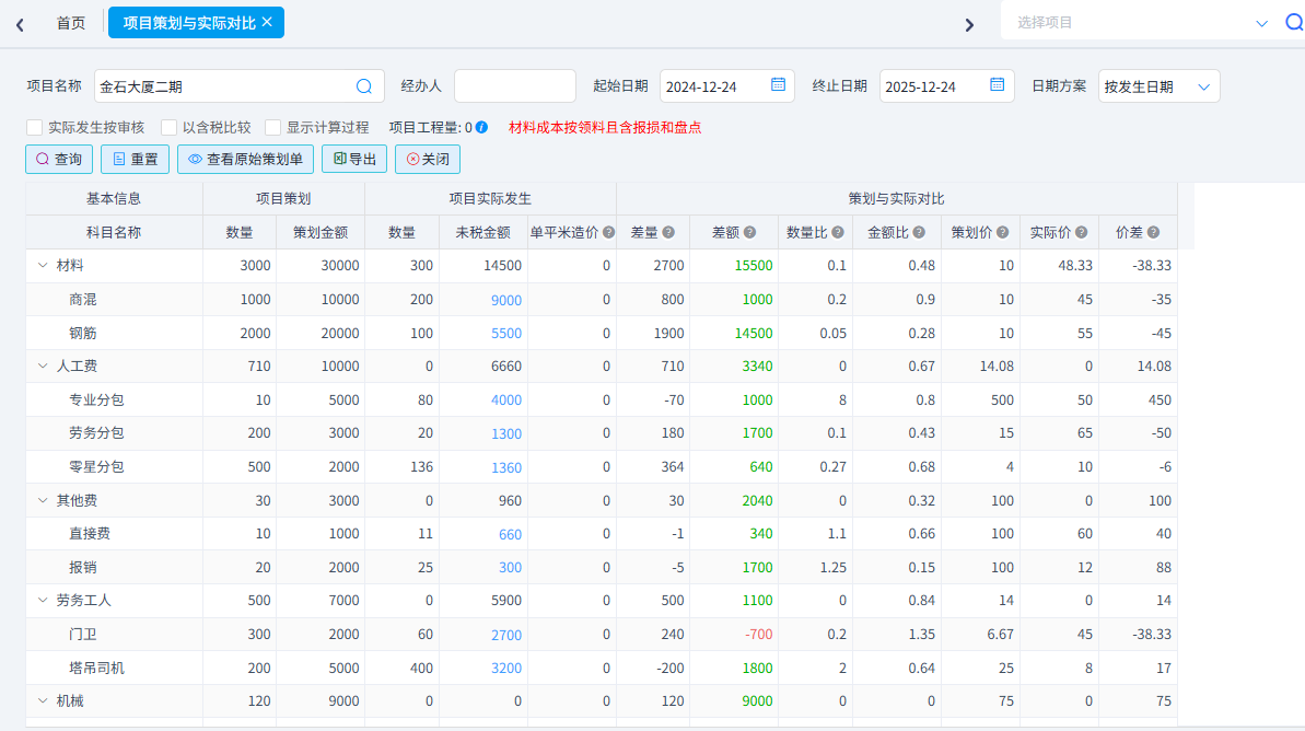 根據(jù)設置的合同人工費、合同材料費、合同機械費、合同周轉(zhuǎn)材、合同專業(yè)分包、合同其他直接費、合同間接費、合同金額、預算人工費、預算材料費、預算機械費、預算周轉(zhuǎn)材、預算專業(yè)分包、預算其他直接費、預算間接費、預算金額16項預算金額與實際發(fā)生金額進行對比,實際發(fā)生金額計算規(guī)則可以根據(jù)查詢規(guī)則進行設置。