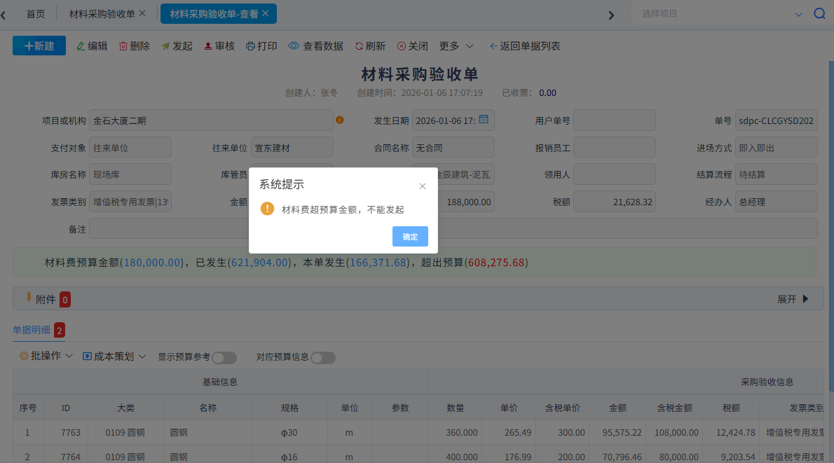 可按照人工費、材料、專業(yè)分包、周轉(zhuǎn)材租賃、機械租賃、其它費用填寫明細預算。成本業(yè)務單據(jù)發(fā)生業(yè)務超出預算后進行預警控制