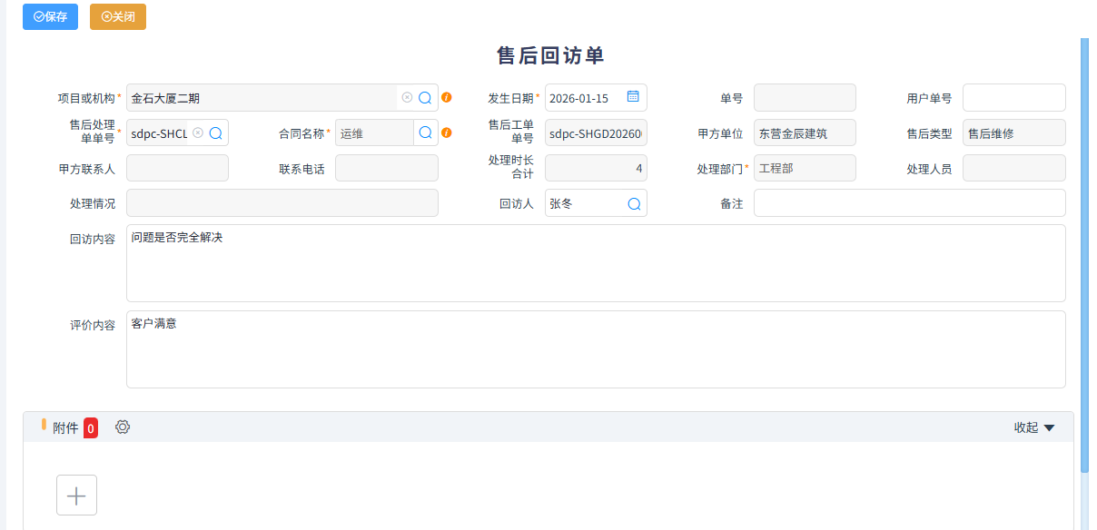 本模塊是專門針對施工企業工程結束后進行售后維保或者施工企業接售后運維項目所設立的模塊。可以管理巡檢、售后工單、技術人員派單、現場添加維修記錄、客戶售后回訪等功能,并能關聯工程結算或者其它收入結算,進行收款。