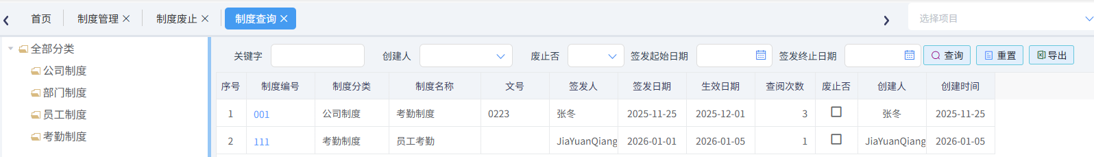 可以根據(jù)關(guān)鍵字,創(chuàng)建人、廢止與否等查詢相關(guān)制度,如下圖所示
