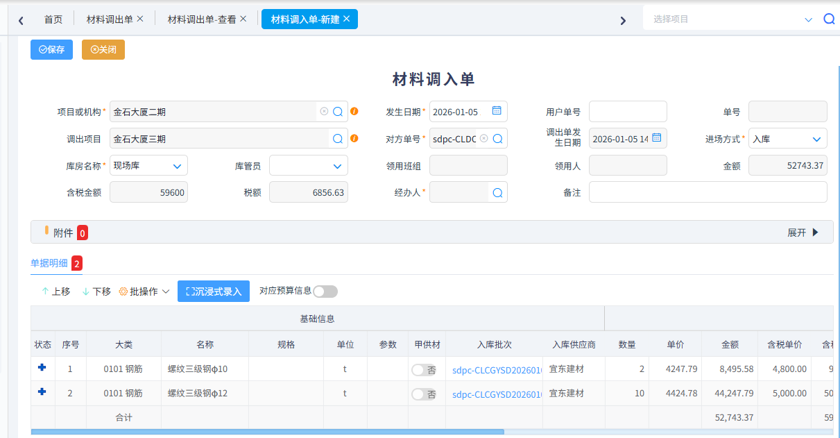 項目與項目或者公司總庫與項目之間調撥材料時由調出方填寫材料調出單,收入方填寫材料調入單,其中調入單必須根據材料調出單生成,調出單含稅金額會產生雙方的應收應付,后期可使用內部資金劃轉單進行資金支付。 材料調出單中發票類別選了帶稅率的類型,稅金也能調撥,為后續項目稅金月結單使用。