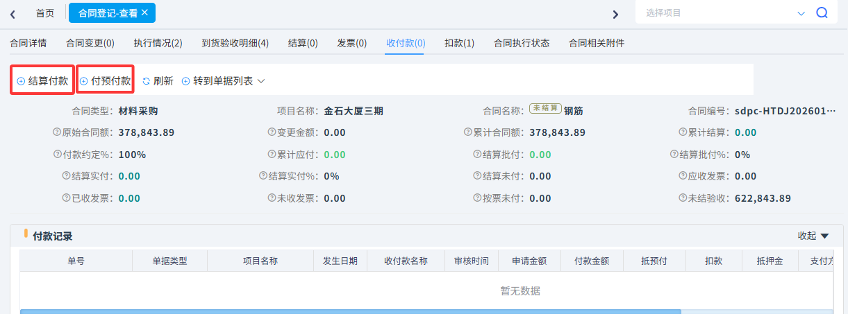 我們以生成合同為例,在合同里可以操作合同變更、材料到貨驗收、材料退貨、材料結算、合同扣款、合同預付款、合同結算付款、合同收進發票。