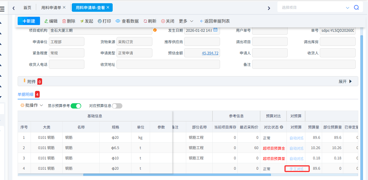 首先由項目現場施工員根據工程進度填寫用料申請。申請材料明細可以從工料機預算中調取,超出預算時系統會進行預警,當購買的材料跟預算不一致是還可以手動對應預算。在用料申請單還可以選擇貨物來源,選擇采購訂貨、自購、調撥、甲供。其中選擇采購訂貨可以生成采購訂貨單和采購合同一般用于大宗采購或者集采。選擇自購可以直接生成采購訂貨單,一般用于零星采購或者項目部直接采購。調撥用于申請項目調撥材料使用,后續可以生成材料調出單。甲供用于申請甲供材料,后續可以生成材料甲供驗收單。